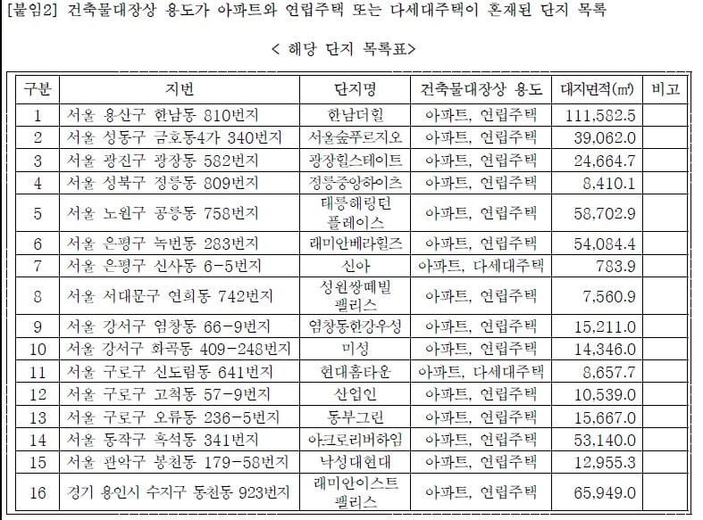 앞서 용산구 한남더힐의 경우 올해 3월 서울시의 토지거래허가구역 지정에 따라 아파트 부분은 토지거래허가 대상이 됐으나 같은 단지에 있는 연립주택은 허가 대상에서 제외돼 논란이 있었다.