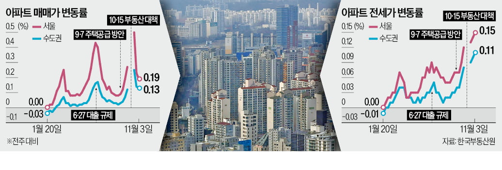 ‘10·15 부동산 대책’ 시행 후 서울과 수도권 주요 지역 아파트값 오름세가 한풀 꺾이고 있다. 서울 전역과 경기 12곳을 ‘삼중 규제’(조정대상지역·투기과열지구·토지거래허가구역)로 묶어 대출 규제 등을 강화한 영향이다. 경기 구리, 화성 동탄 등 규제에서 비켜난 지역에선 상승 폭이 커지며 ‘풍선 효과’도 일부 나타나고 있다. 전세 물건 부족으로 수도권 전셋값은 강세를 이어가고 있다.