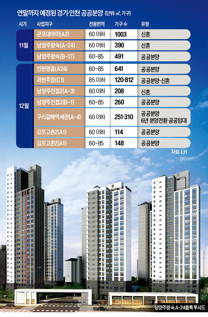 12월에는 남양주 진접2지구 B-1블록(공공분양·260가구) 및 A-3블록(신혼희망타운·208가구), 구리갈매역세권지구 A-4블록(공공분양 251가구, 6년 분양전환 공공임대 310가구), 김포고촌2지구 A1블록(공공분양·262가구), 인천 영종지구 A24블록(공공분양·641가구)에서 순차적으로 공급된다.