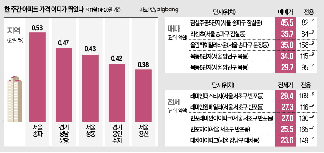 지난주(11월 14~20일) 전국 시·군·구 중에서 아파트 가격이 가장 많이 오른 지역은 서울 송파구였다. 1주일 새 0.53% 올랐다. 직전 2주간 집값 상승률 1위를 달리던 경기 성남 분당구(0.47%)는 이번엔 2위를 기록했다. 서울 성동구와 경기 용인 수지구는 각각 0.43%, 0.42% 상승하며 뒤를 이었다. 서울 용산과 경기 광명은 0.38% 오르며 공동 5위에 이름을 올렸다.
