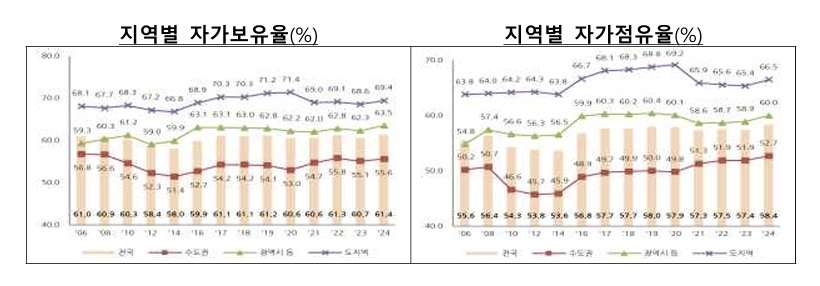 국토교통부가 전국 표본 6만1000가구를 대상으로 조사한 2024년도 주거실태조사 결과에 따르면 자가를 ‘보유’하고 있는 가구는 전체 가구의 61.4%로 2023년도(60.7%)에 비해 0.7%포인트 증가했다. 지역별로는 도 지역(69.4%), 광역시 등(63.5%), 수도권(55.6%) 순으로 자가 보유율이 높았다. 모든 지역에서 2023년 대비 증가했다.
